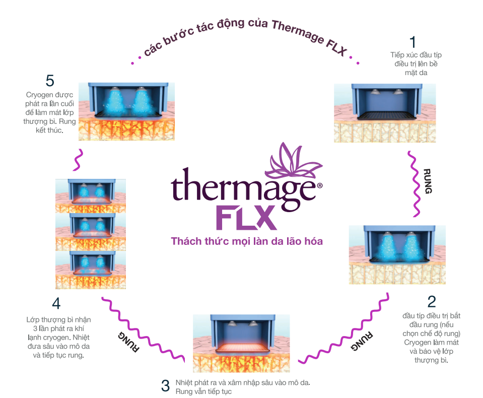 Trẻ hóa da Thermage FLX là phương pháp sử dụng năng lượng sóng RF đơn cực (radiofrequency) để làm nóng có kiểm soát các lớp sâu dưới da. Trong quá trình này, máy Thermage FLX sẽ truyền năng lượng xuống lớp trung bì và mô dưới da, làm nhiệt độ tăng lên đến khoảng 55 – 60°C.